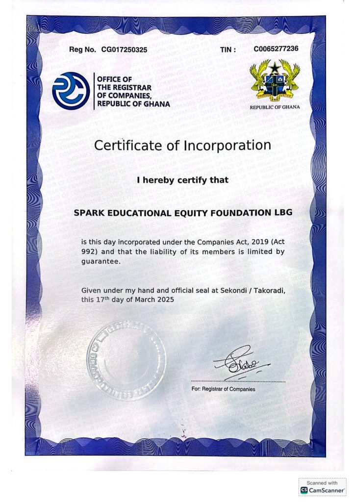 We are thrilled to announce that Spark Educational Equity Foundation (SEEF) is now a legally certified non-profit organization under the laws of Ghana. 🏆📜